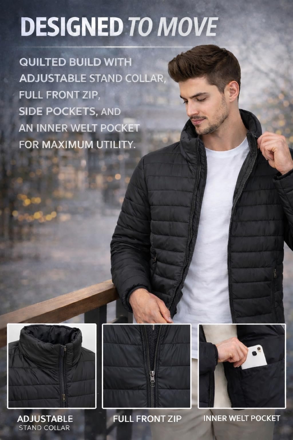 - PRACTICAL & FUNCTIONAL DETAILS: Features a full front zipper, stand collar for wind protection, side pockets for essentials, and an inner welt pocket for added utility.