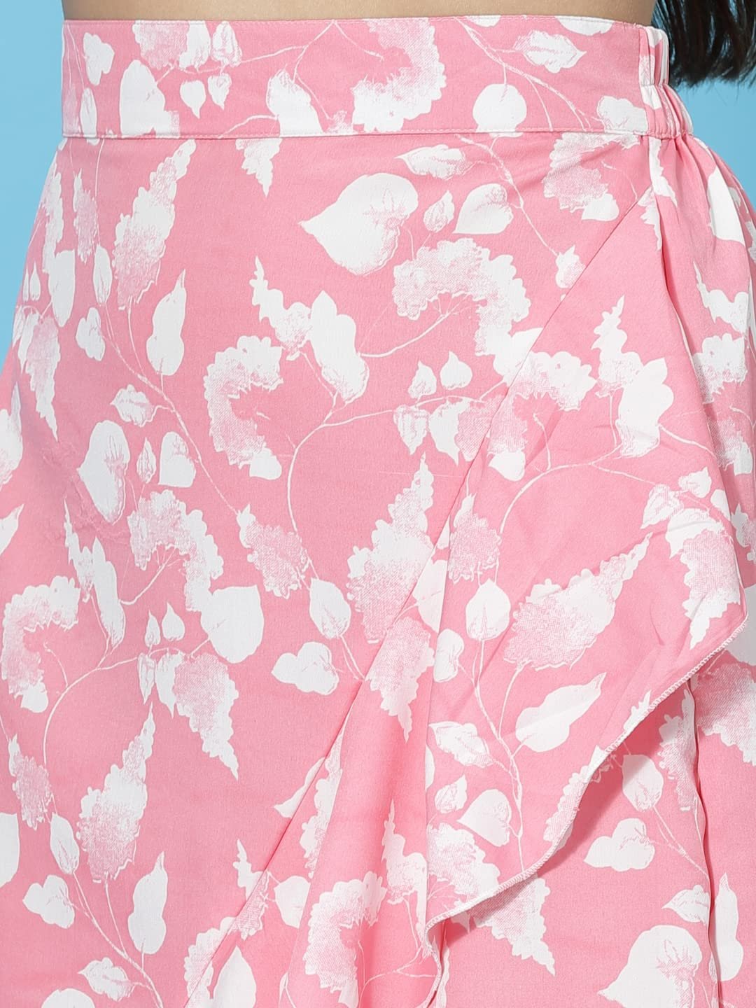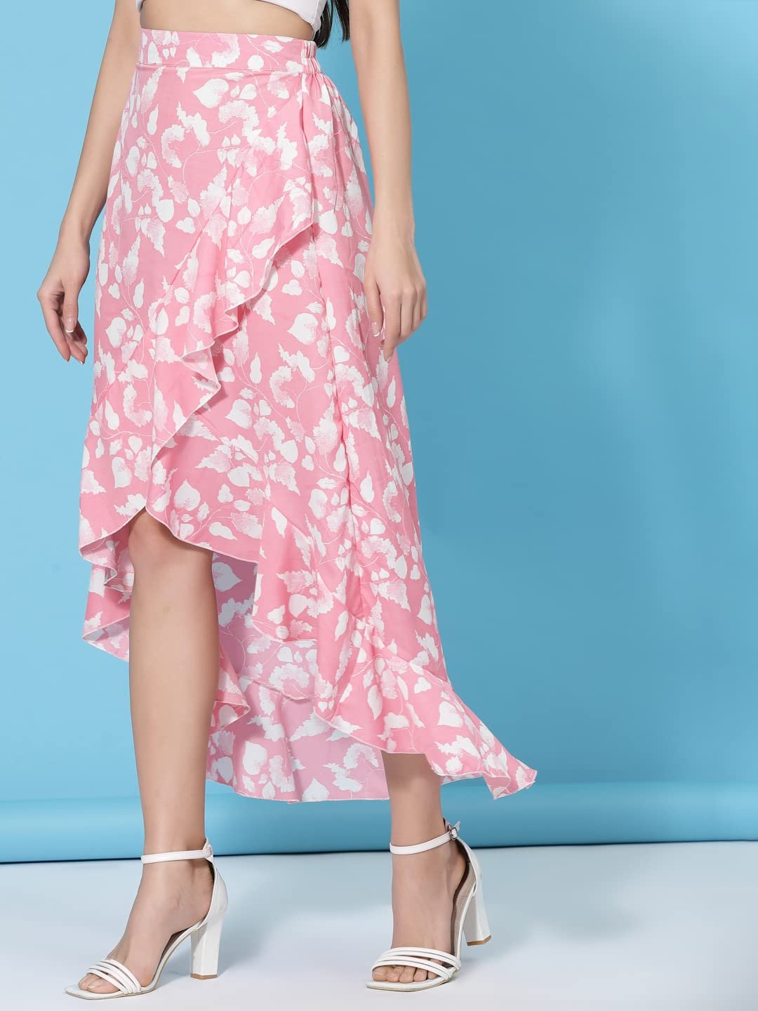 Long high-low wrap skirt with ruffle detail on hem and elastic on waist band. Fabric is crepe which is light weight, drapes well and is wrinkle free. Floral print is perfect for spring & summer. Suitable for casual wear, summer wear, beach wear and festive wear. Suitable for skirts for women western wear, skirt for women western wear, women skirts western, long skirts for women western wear, wrap skirts for women, wrapper skirt for women, long skirt, ,