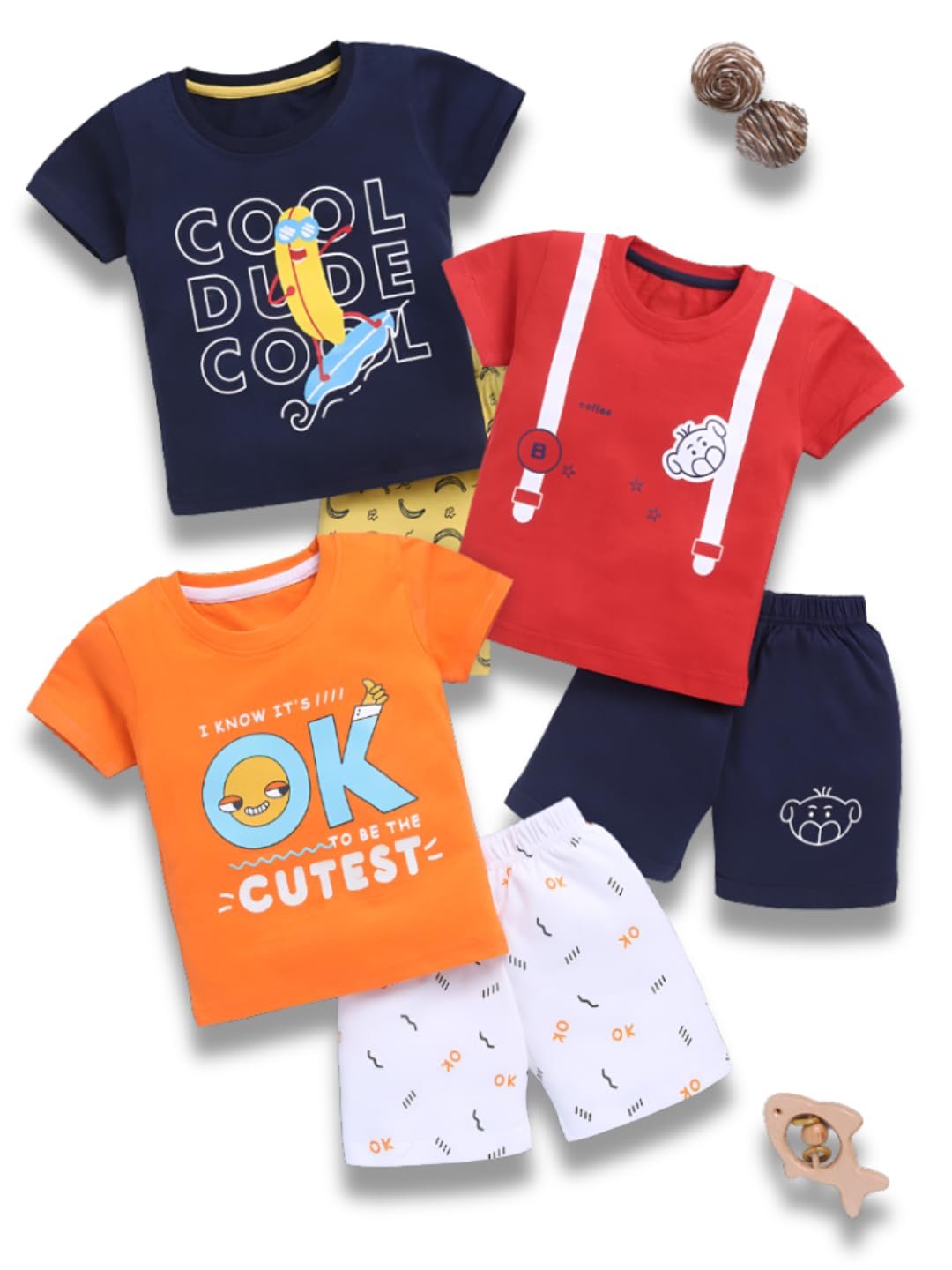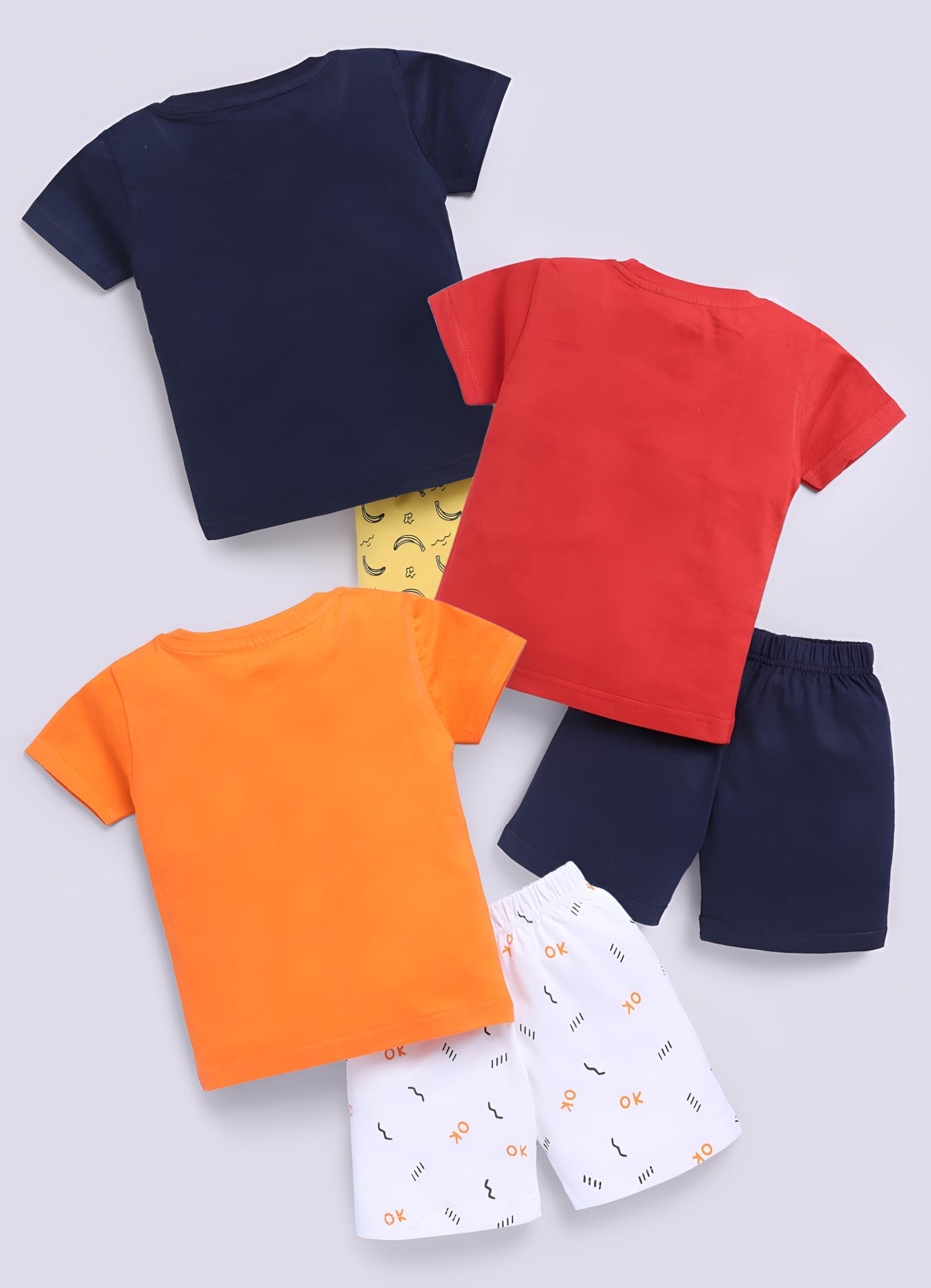 - SET CONTENTS: Three delightful summer outfits featuring navy, red, and orange t-shirts with coordinating shorts, designed for boys
