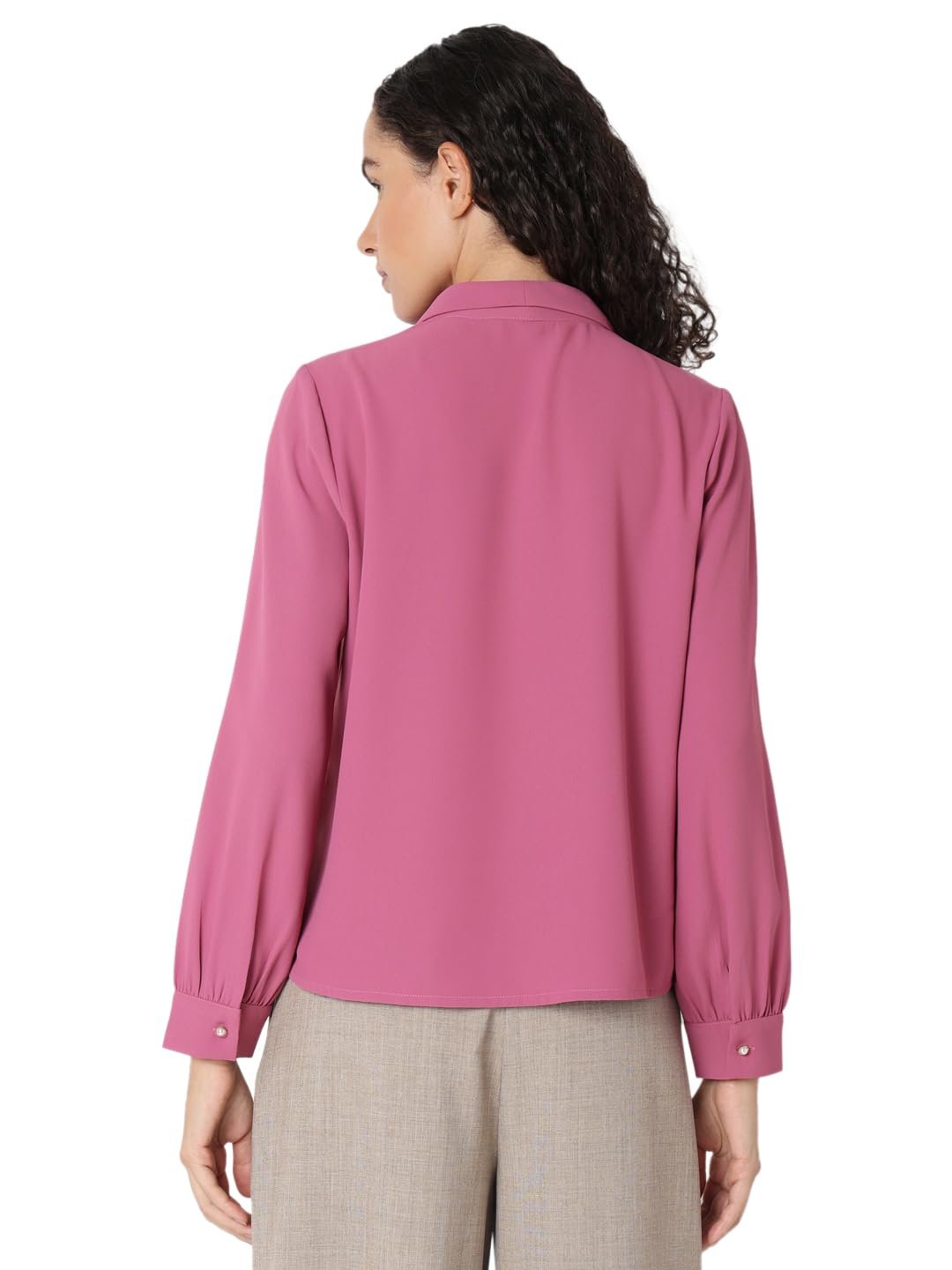 Elevate your wardrobe with this chic piece featuring a gracefully draped shawl collar, adorned with delicate pearl buttons. The full sleeves with cuff details add a touch of refinement. Designed to gracefully fall at the hips, this top effortlessly combines comfort and style. Whether paired with tailored trousers for a polished look or dressed down with your favourite denim, it’s a versatile wardrobe essential.